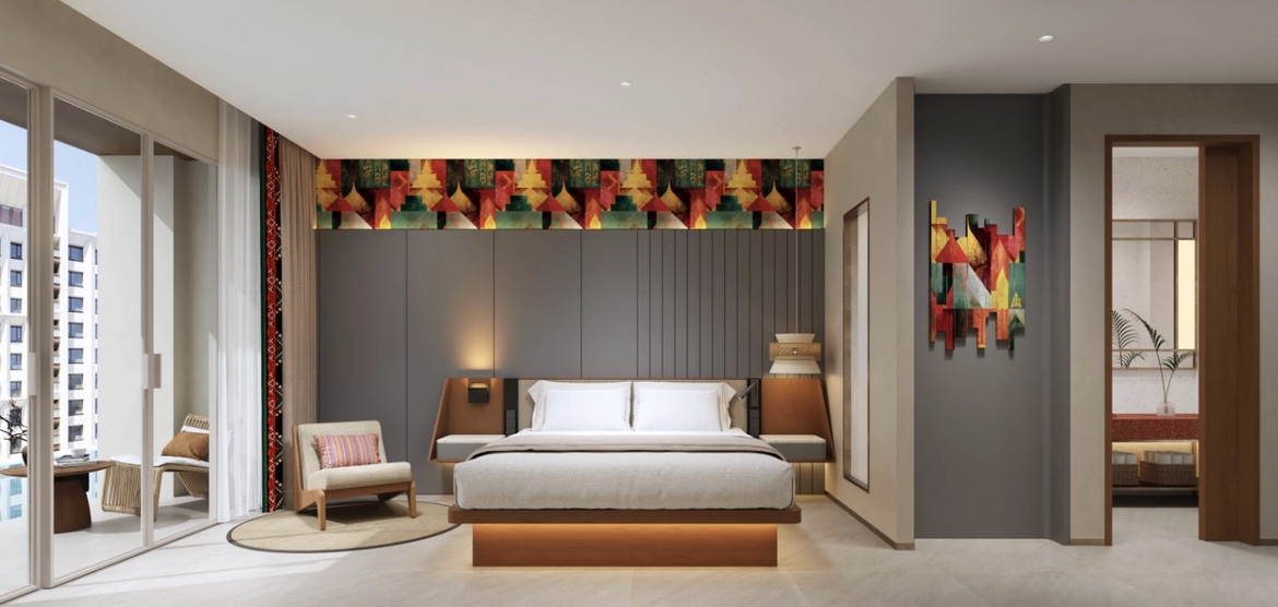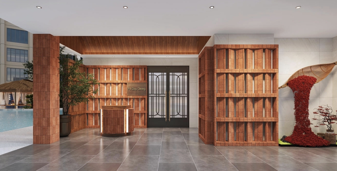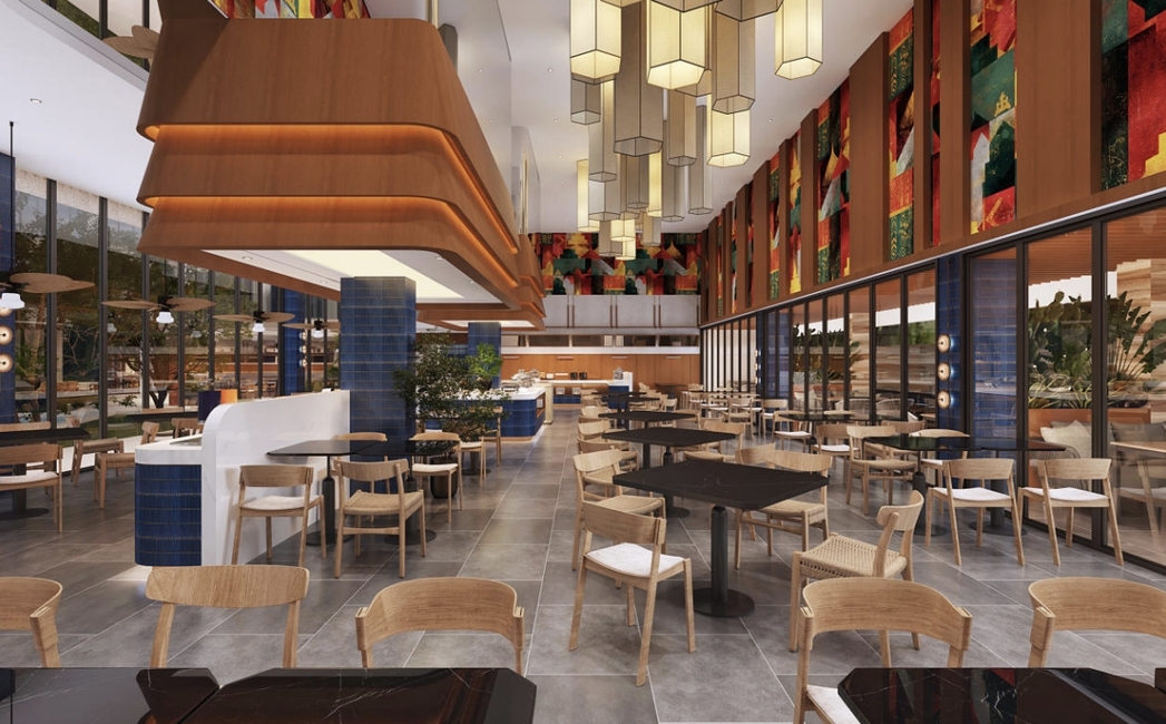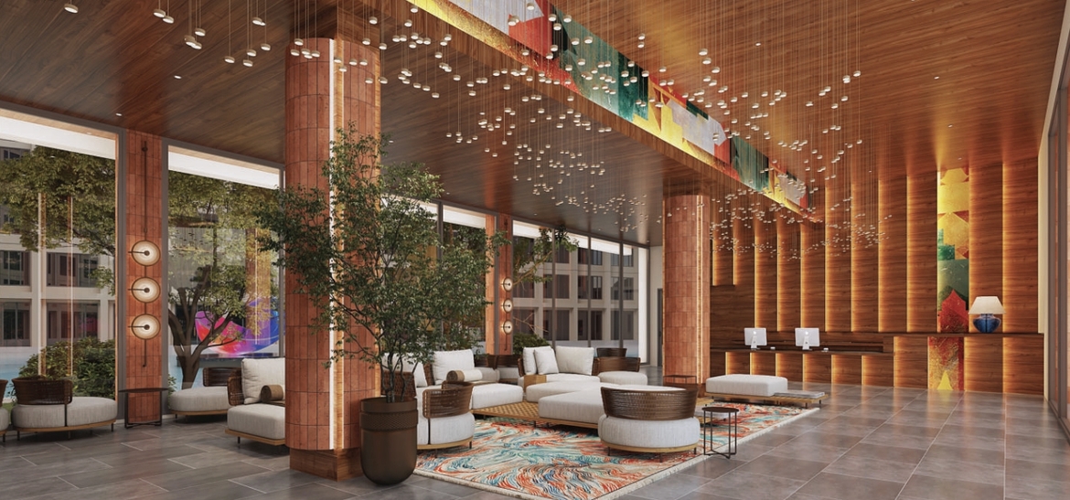 The Blue Lagoon lobby is designed with panoramic windows, bringing natural light and tropical scenery into the heart of the building. Its contemporary aesthetic blends metallic tones with natural wood elements, representing the perfect harmony of modern innovation and ecological inspiration. This unique design philosophy reflects a fresh interpretation of modern Thai architecture—stylish, warm, and inviting.