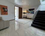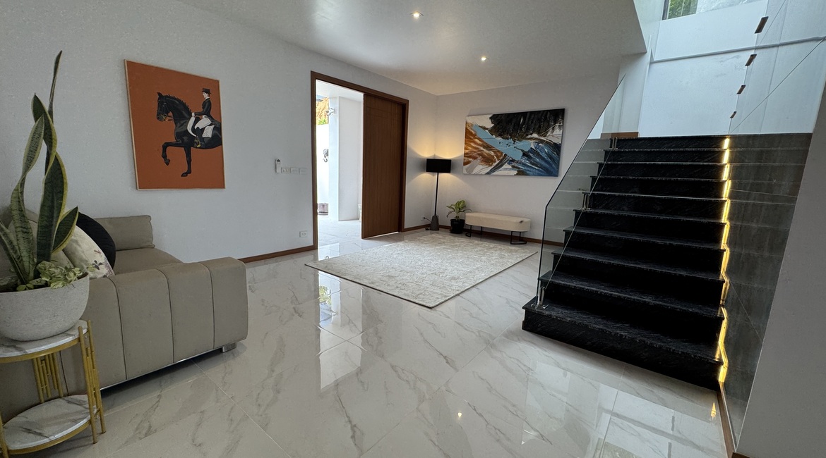 Entering the villa from the lower level, you’ll find a double carport and three elegantly designed bedrooms: the master suite and two guest rooms. Each bedroom comes with an ensuite bathroom, with the master suite featuring a more spacious bathroom equipped with both a bathtub and a separate shower. This level also houses storage and laundry facilities.