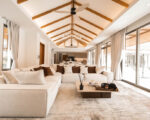 Open-plan living, dining, and kitchen areas with high ceilings and large windows