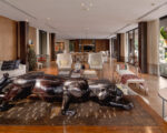 Even the lift is magnificent, framed by intricate wooden doorway frames, and with dramatic black interiors highlighted by a gold-plated leaf. Allowing easy mobility to the elderly, the elevator deftly takes you to the lower levels, where the polished teak hardwood floors sweep into five spacious bedroom suites and an expansive living and dining room.